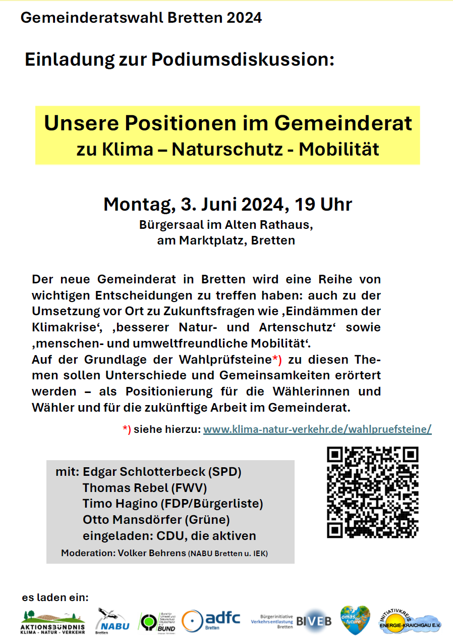 Der neue Gemeinderat in Bretten wird eine Reihe von wichtigen Entscheidungen zu treffen haben: auch zu der Umsetzung vor Ort zu Zukunftsfragen wie ‚Eindämmen der Klimakrise‘, ‚besserer Natur- und Artenschutz‘ sowie ‚menschen- und umweltfreundlicher Mobilität‘.